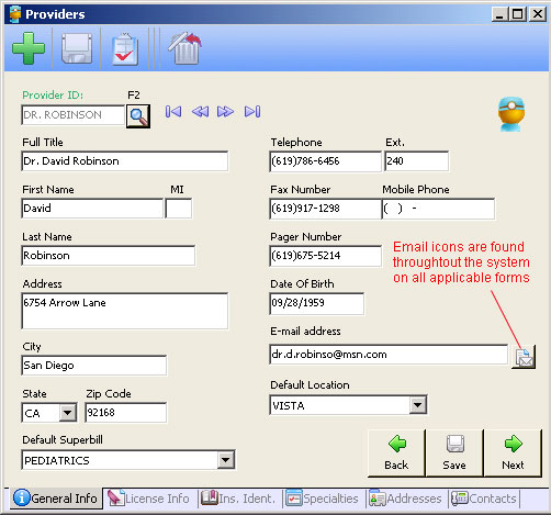 MedOffice. Each patient, provider, insurance, and guarantor record contains an